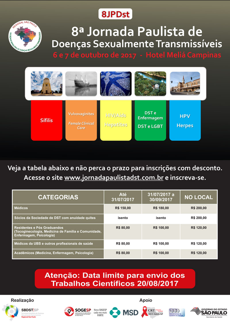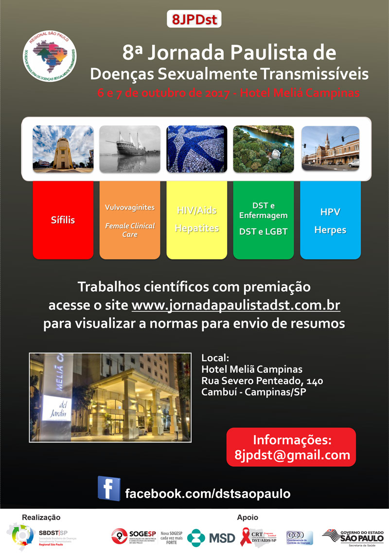Nos dias 6 e 7 de outubro será realizada a 8ª Jornada Paulista de Doenças Sexualmente Transmissíveis a se realizar no Hotel Meliá, em Campinas.