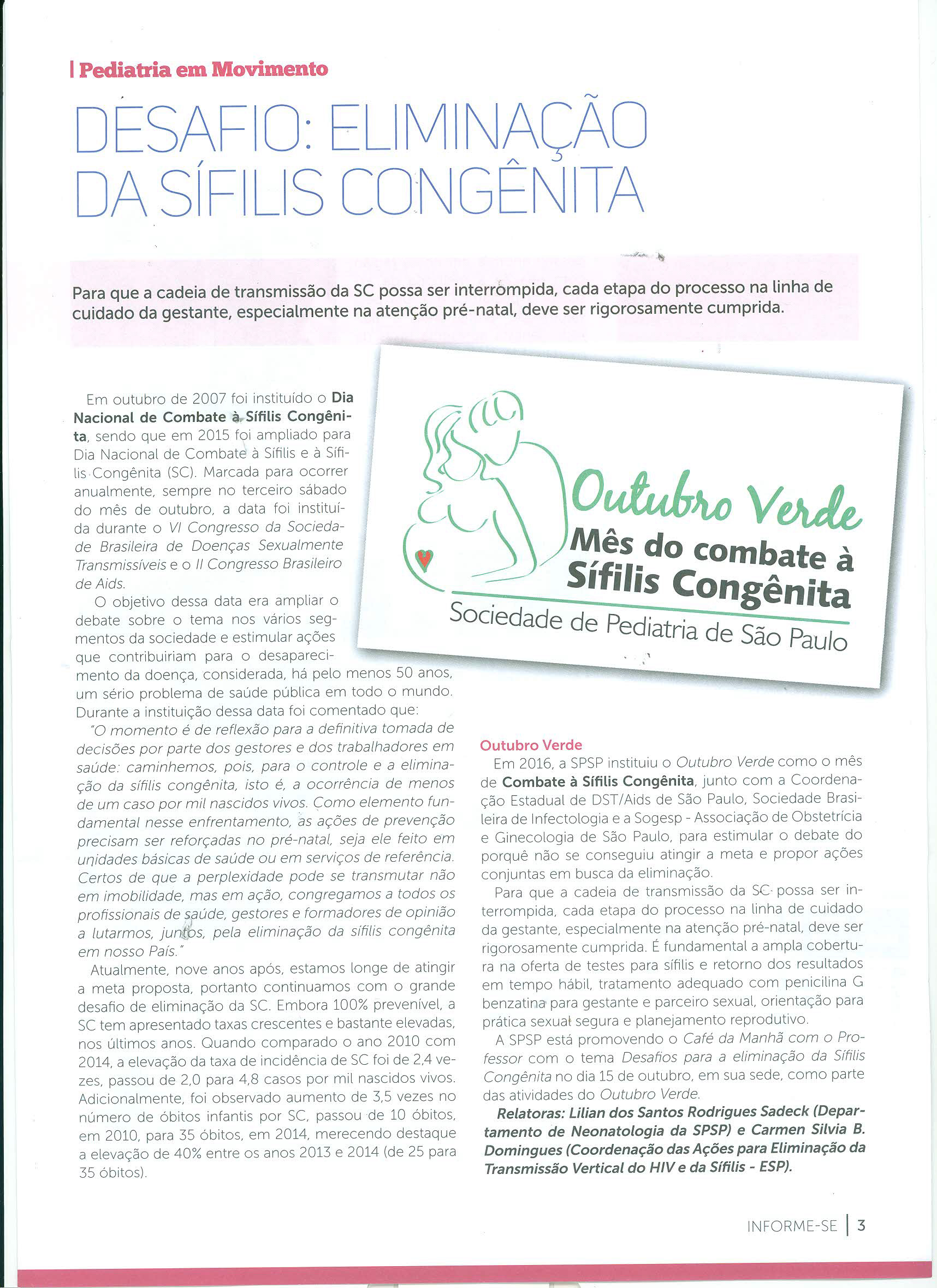 A Secretaria de Saúde de São Paulo, por meio da Coordenação Estadual DST/Aids-SP, e em parceria com Sociedade de Pediatria de São Paulo, Sociedade Brasileira de Infectologia e Associação de Obstetrícia e Ginecologia de São Paulo lançaram o OUTUBRO VERDE para estimular o debate e a busca de ações conjuntas em busca da eliminação da sífilis congênita.