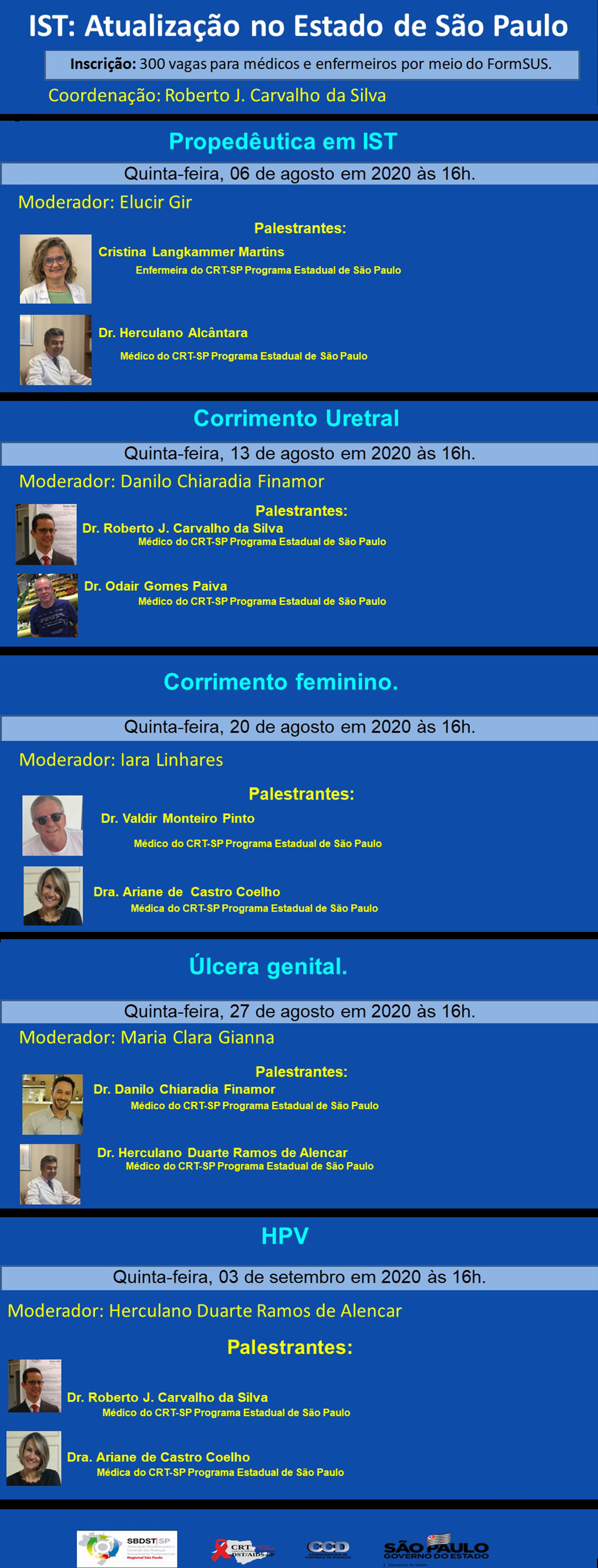 O Centro de Referência e Treinamento DST/Aid-SP, Programa Estadual DST/Aids-SP, convida gestores e  profissionais da saúde para o evento online “IST: Atualização no Estado de São Paulo”, a ser realizado nos dias 06, 13, 20 e 27 de agosto e 03 de setembro de 2020, sempre das 16 às 18h. O encontro tem por objetivo atualizar os profissionais da rede sobre as diretrizes do último Protocolo Clínicos e Diretrizes de Tratamento de IST (PCDT IST). O evento será realizado pela plataforma Zoom.  Estamos enviando a programação com os temas de cada encontro. O público alvo (médicos e enfermeiros) deverá se inscrever pelo link http://formsus.datasus.gov.br/site/formulario.php?id_aplicacao=57739 até o dia 03 de setembro para garantir sua vaga e seu certificado.  Solicitamos que no momento do acesso ao link de transmissão da Web que será enviado em breve, identifiquem-se corretamente preenchendo: seu município, nome e a unidade em que trabalha.