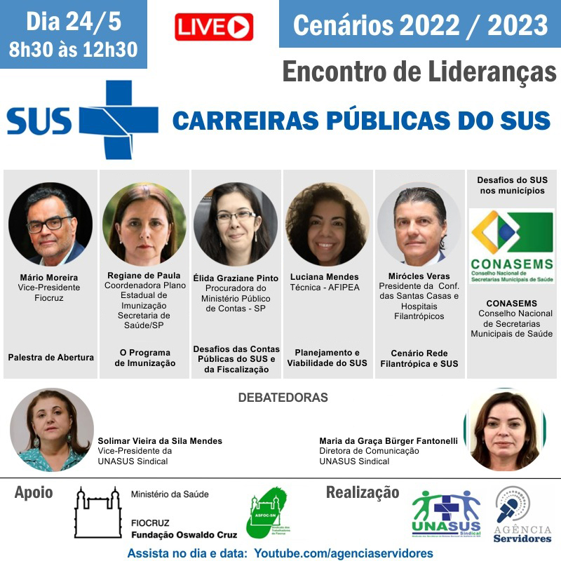 Dia 24 de maio, terça-feira, ocorre a live “Encontro de Lideranças das Carreiras Públicas do SUS”, entre 8h30 e 12h30, com palestras e debates sobre cenários do SUS, de curto e médio prazo.