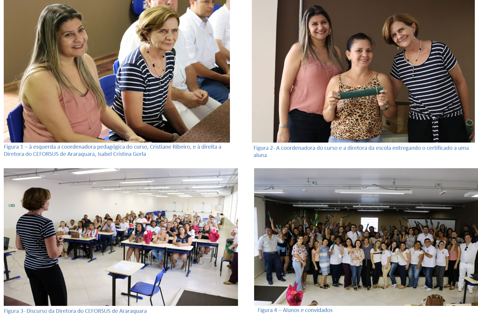 O Centro de Formação Recursos Humanos para o Sistema Único de Saúde de Araraquara (CEFORSUS de Araraquara), Escola Técnica subordinada à Secretaria Estadual de Saúde de São Paulo e que compõe a Rede de Escolas Técnicas do SUS vinculada ao Ministério da Saúde, qualificou 47 Agentes Comunitários de Saúde em duas turmas sob a coordenação local de Tânia Mancini Bambozzi e Elisângela Jóia no município de Matão. No dia 30/08/18 aconteceu o evento de finalização do Curso de Formação Inicial de Agente Comunitário de Saúde - ACS, Módulo I, do itinerário de profissionalização do Curso Técnico de Agente Comunitário de Saúde no município de Matão com a presença da Diretora do CEFORSUS de Araraquara, Isabel Cristina Gorla, da Coordenadora Pedagógica do Curso, Cristiane Ribeiro. A diretora da escola falou sobre a importância da qualificação dos Agentes Comunitários para a contextualização, aproximação e dimensionamento dos problemas de saúde da comunidade, o seu perfil social e comunitário e o seu papel no âmbito da equipe multiprofissional do rede básica do SUS na promoção, prevenção, recuperação e reabilitação. |
