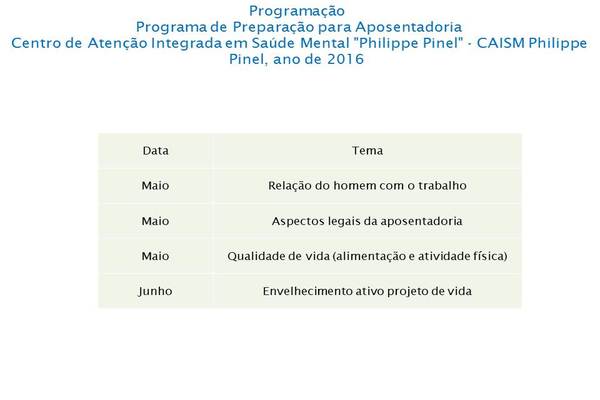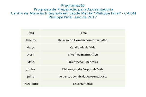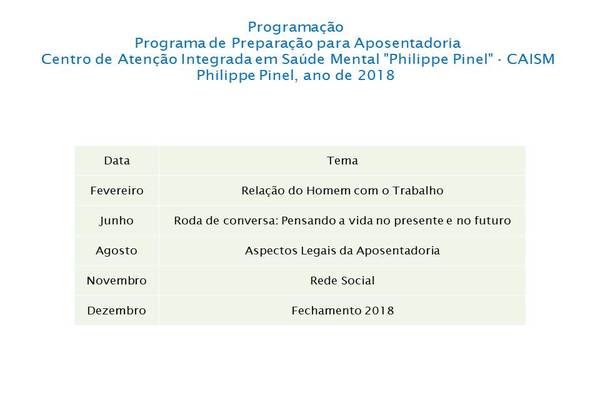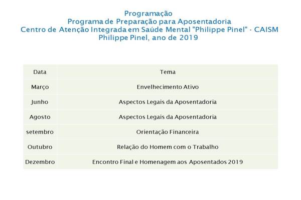 A SES (Secretaria Estadual de Saúde) estabelece até dois anos de adquirir a aposentadoria, porém, em função de termos um pequeno grupo de pessoas de até dois anos para se aposentar, sugerimos incluir todos os Servidores que estejam interessados pelo assunto e participação por demanda espontânea.