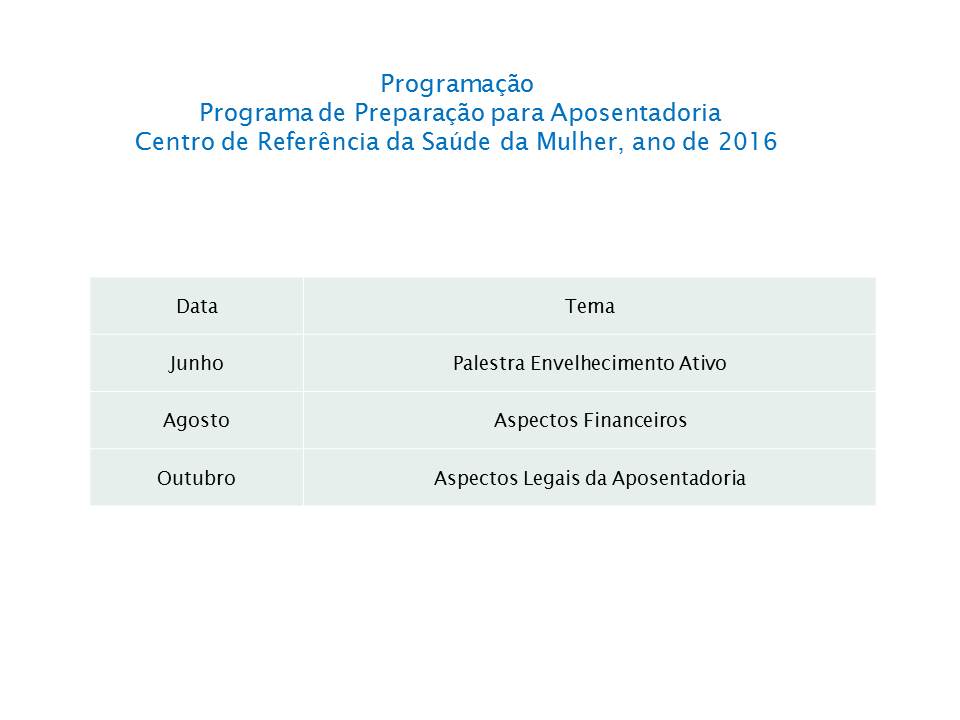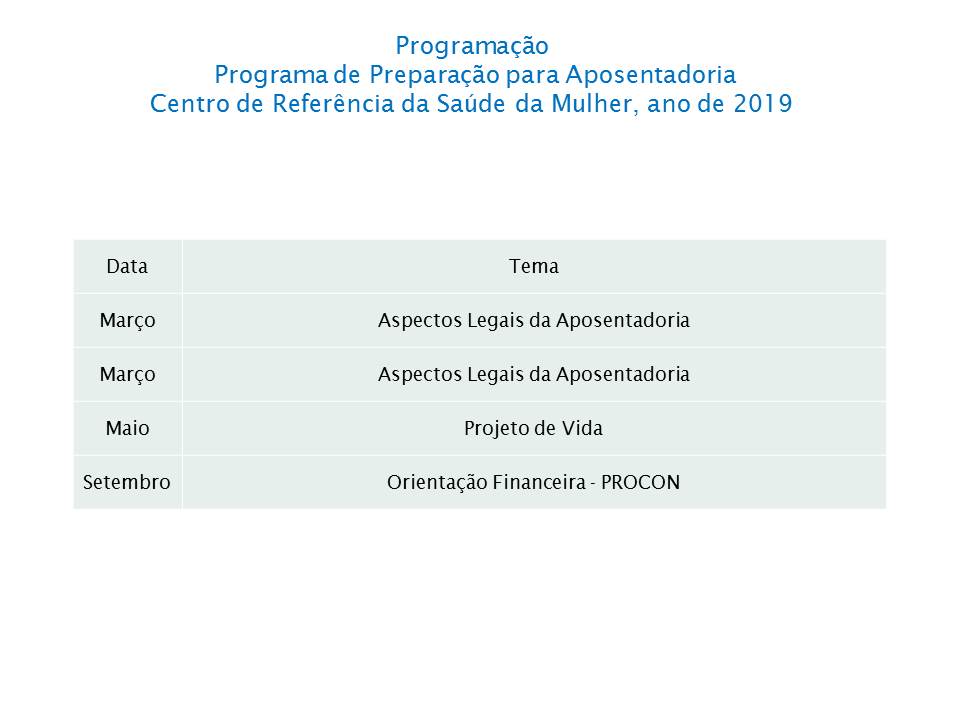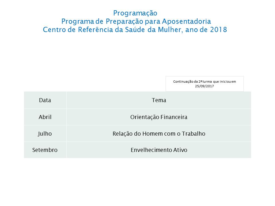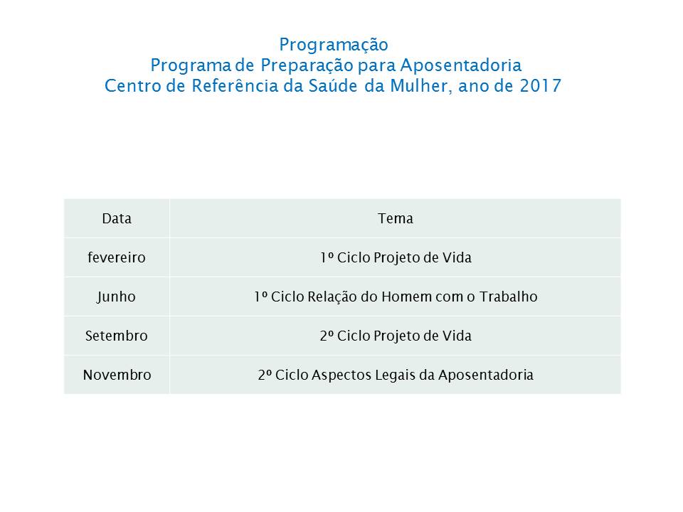 Propósito orientar, oferecer ao servidor, um espaço de reflexão onde serão desenvolvidas ações para auxiliar, avaliar e planejar novo ciclo de vida este programa buscar bem estra a satisfação e a motivação das pessoas.
