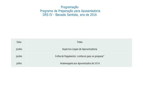 Acreditando no Programa de Preparação para a Aposentadoria o DRS IV BAIXADA SANTISTA, criado pelo decreto 51433 de 28 de dezembro de 2016 vem desenvolvendo atividades que tem como objetivo: