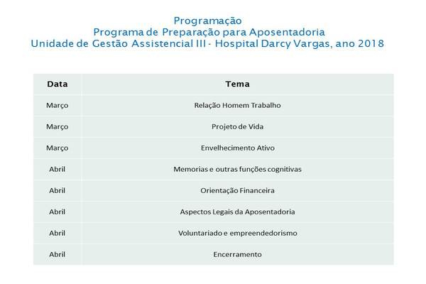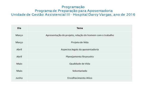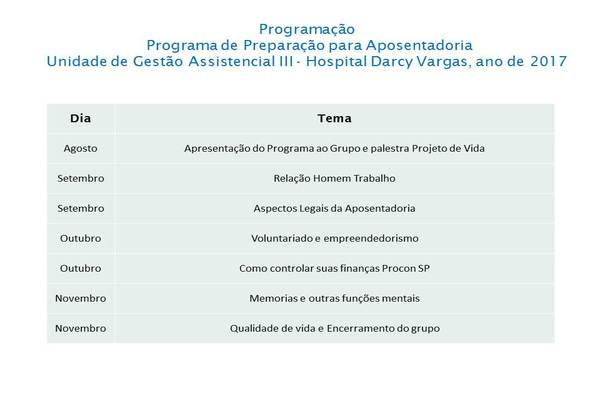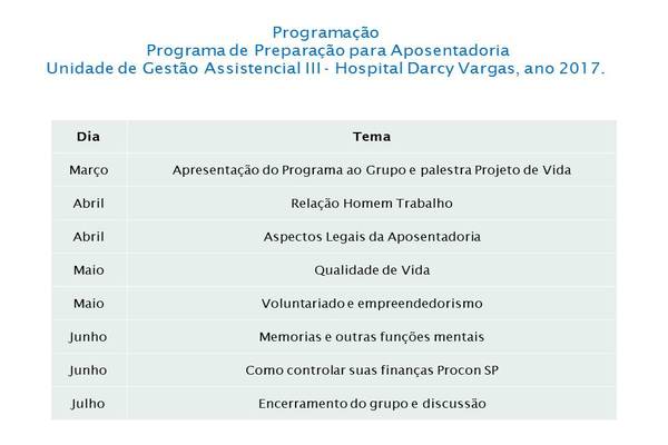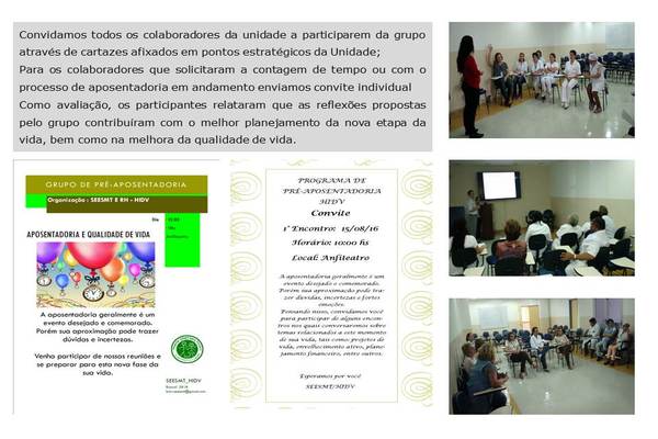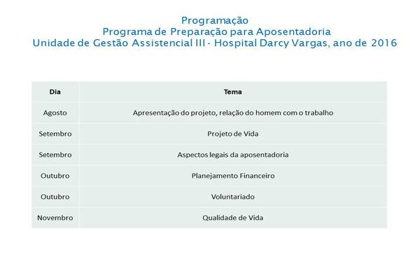 Foram realizado 5 encontros, abordando temas: Apresentação do projeto / relação do homem com o trabalho, Projeto de vida, Aspectos legais da Aposentadoria,Qualidade de Vida, Planejamento financeiro.