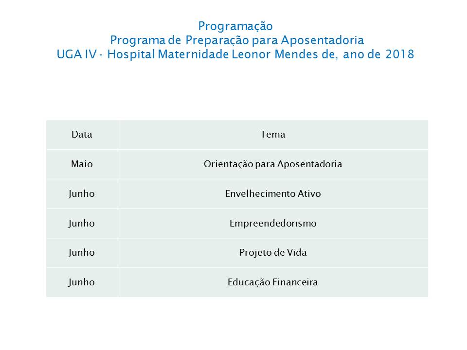 O Programa de Preparação para a Aposentadoria iniciou no HMLMB no dia 28 de maio, com a apresentação do tema "Orientações do RH para a Aposentadoria” ministrada pelas colaboradoras Solange de Oliveira Santos e Rita de Cássia Delfino.