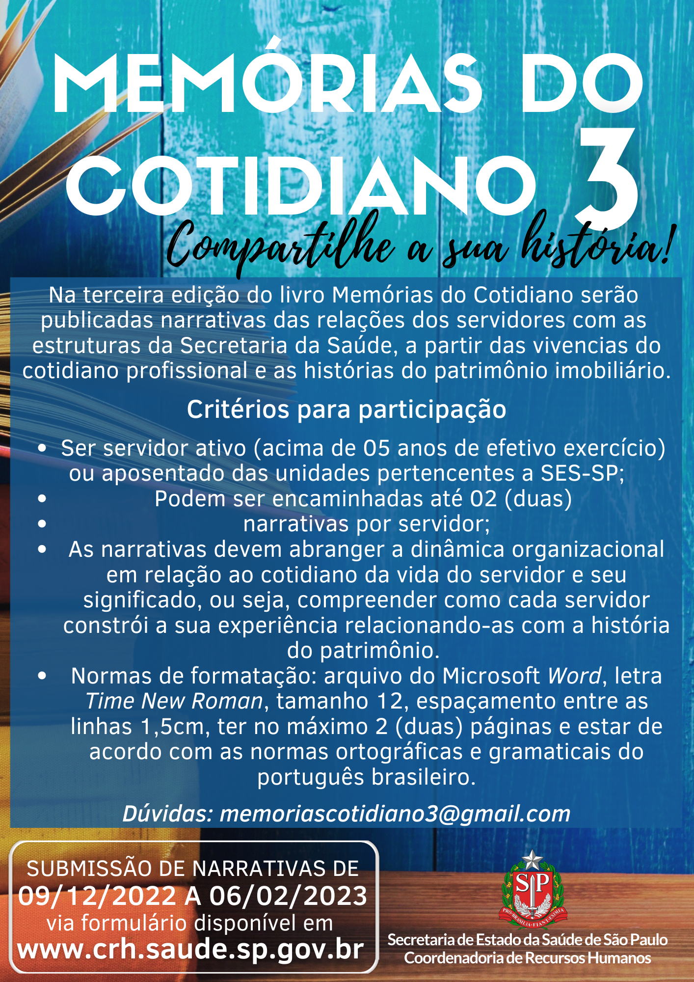 A coleção "Memórias do Cotidiano" terá o terceiro número publicado com objetivo de registrar as relações dos servidores com as estruturas da SES/SP, descrevendo suas vivências do cotidiano profissional e as histórias do patrimônio imobiliário. Além das narrativas dos Servidores nesta edição serão evidenciadas as arquiteturas de prédios onde estão instalados serviços de saúde da Secretaria.